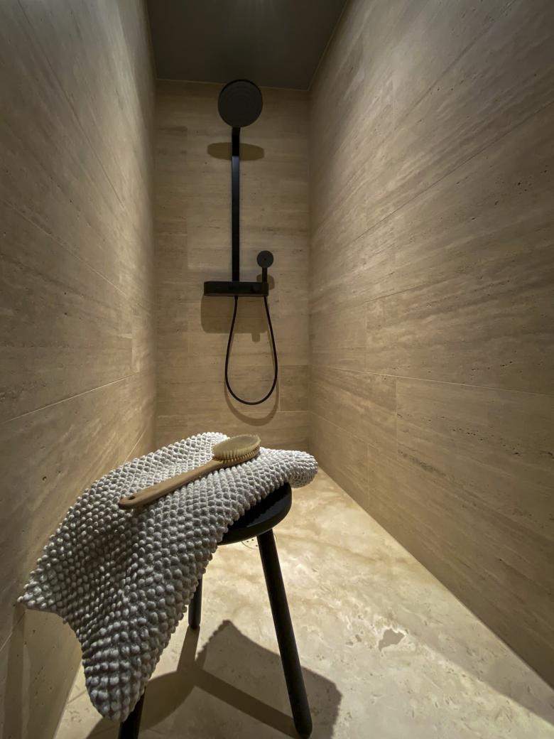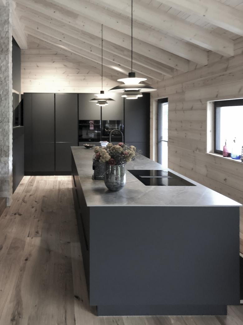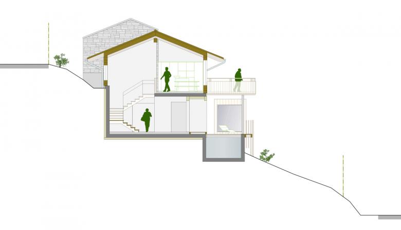 Aufgesattelt auf einem Sockel in Massivbau liegt ein langgezogener Holzbau, gegliedert in einen offenen Wohnteil und einen Remisenteil (Garage). Das Gebäude ist im Hang gestaffelt - es ergeben sich Abstufungen, welche unter Anderem als Swimmingpool genutzt werden.