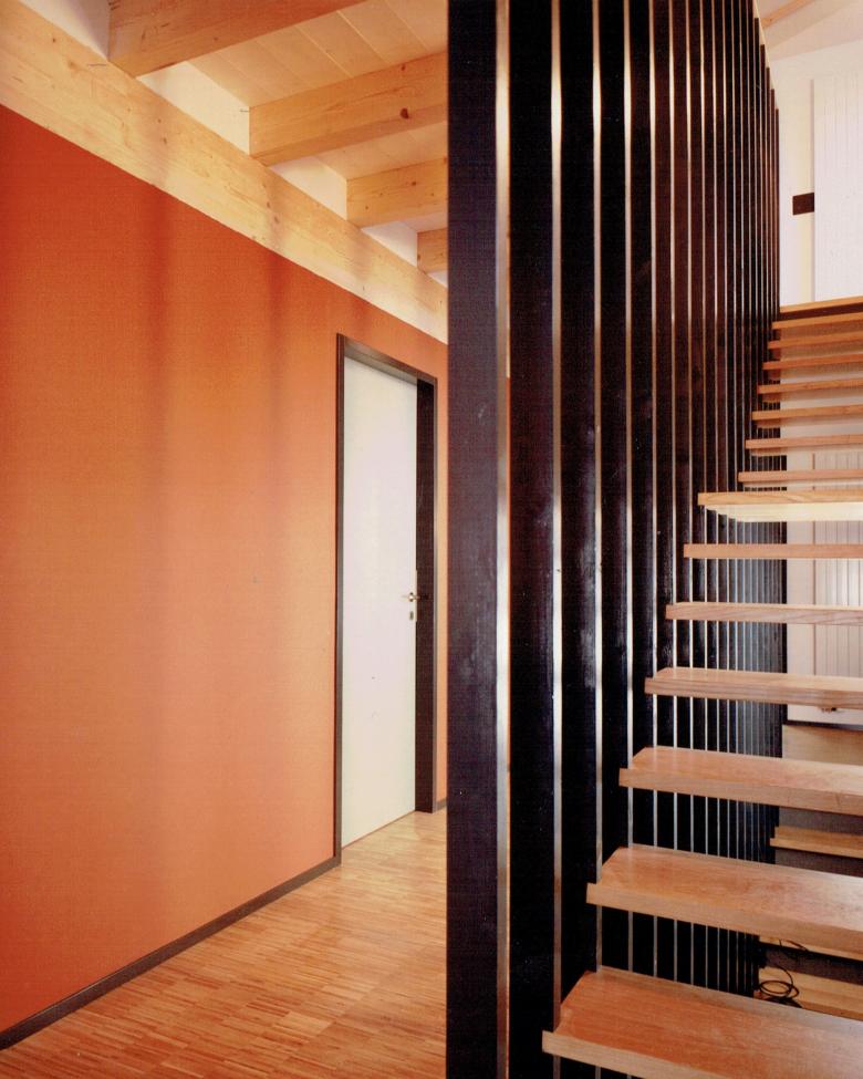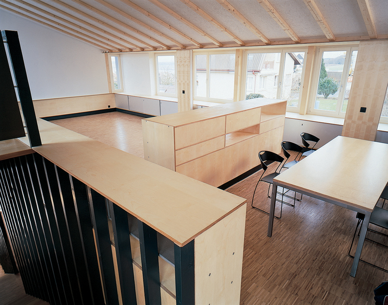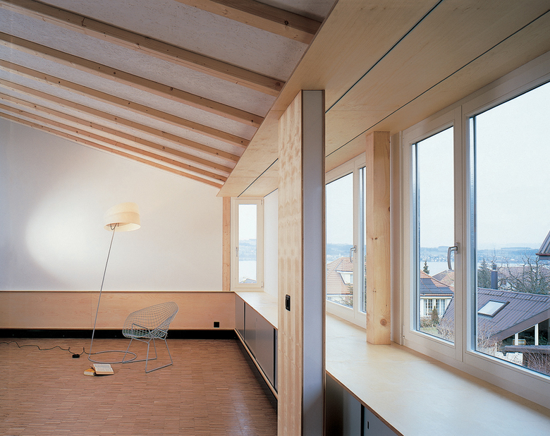 Das Einfamilienhaus, aus einem vorgegebenen Gestaltungsplan entwickelt, in schöner Hanglage am Siedlungsrand des Dorfes mit Sicht auf den Sempachersee, ist ausgeprägt gegliedert um eine entsprechende Nutzung zu erzielen. Das Gebäude besteht aus zwei Baukörpern - einem harten, nicht gedämmten, plastischen Betonkubus und einem leichten, abgesetzten Holz-Trakt. Die Schnittstelle der beiden Konstruktionsteile bildet eine Kaskadentreppe, welche die im Split-Level angeordneten Ebenen erschliesst.
