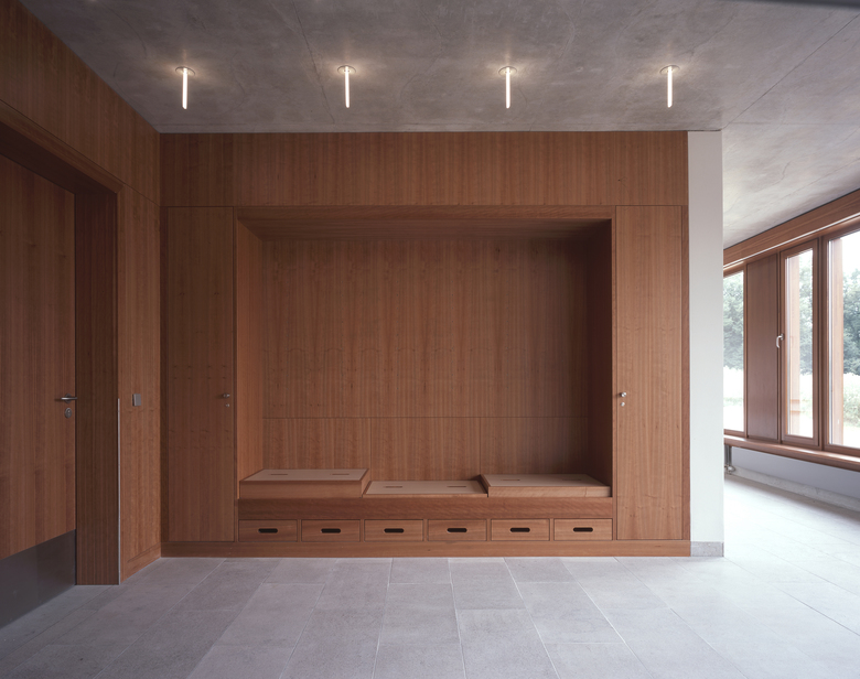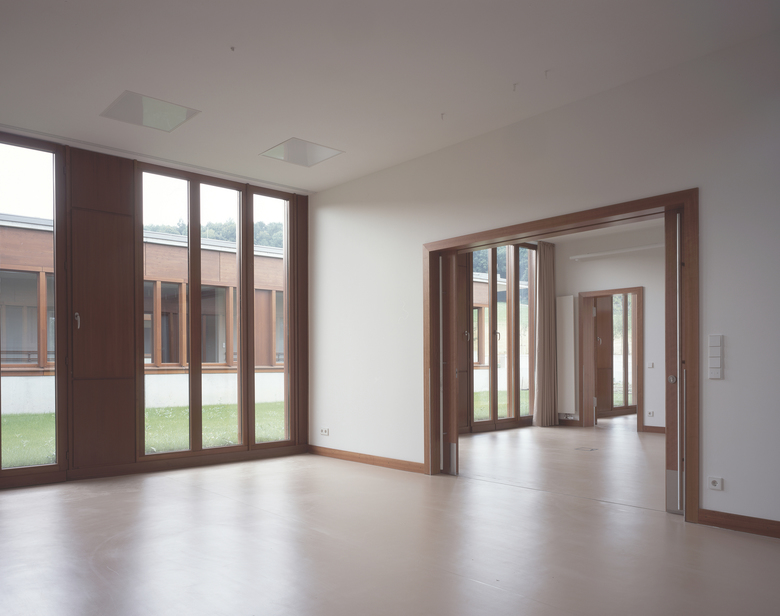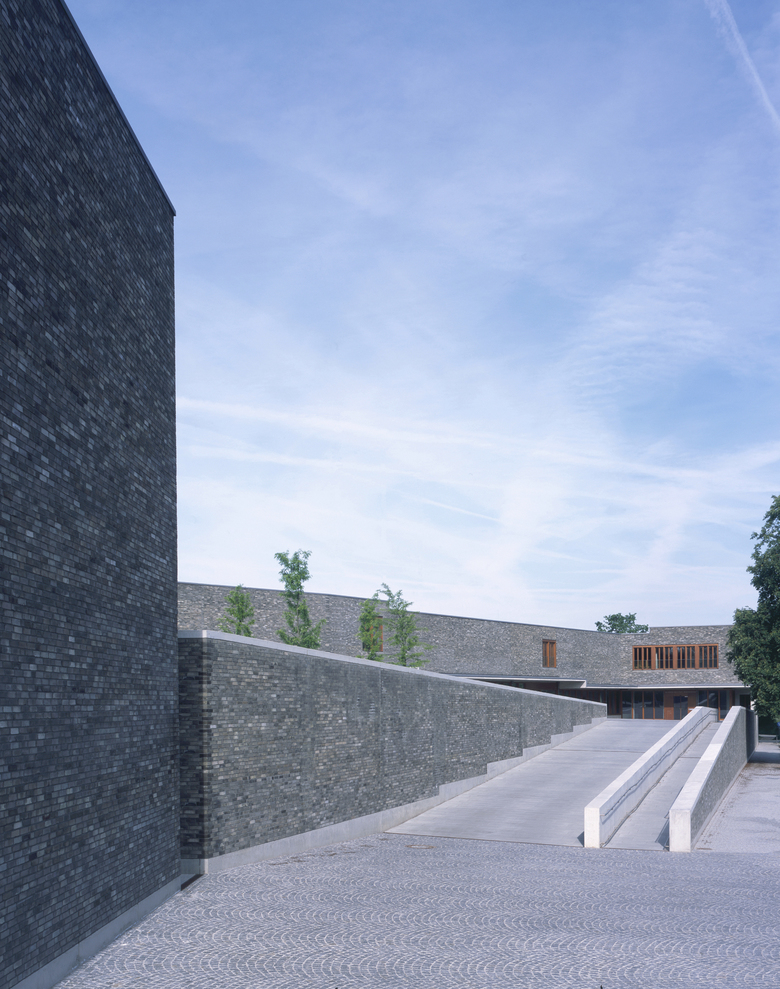 Die Einrichtung betreut schwer seh- und mehrfach behinderte Kinder, die auf ein schwellenloses Ineinandergreifen der Räumlichkeiten angewiesen sind. Daher entstanden eingeschossige Schulbereiche, die sich am Hang in geringen Höhenschritten hinaufstaffeln und sich mit dazwischen liegenden, intimen Höfen in die Landschaft integrieren. Sie sind Teil einer gebauten Topographie. Der verwendete, grüngrau reduzierte Kohlebrandziegel kommentiert die landschaftliche Szenerie und den historischen Klosterkomplex „Schloss Prüfening“ vis à vis.