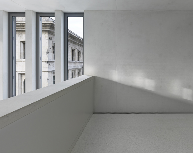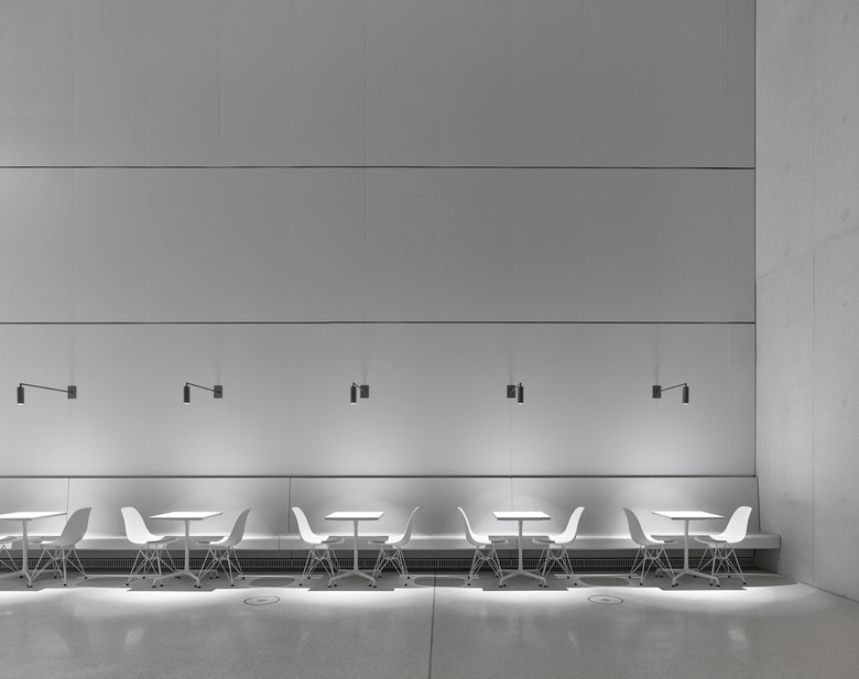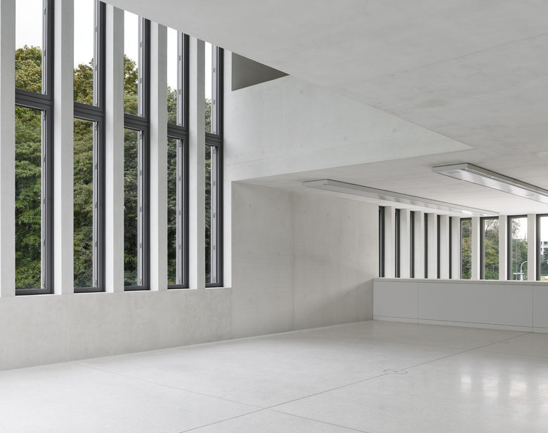 Der Baukörper ist als ein exakter Kubus aus Weißbeton mit den Abmessungen 22,50 x 22,50 x 22,50 m geplant. An seiner Westseite ist eine quadratische Terrasse, ebenfalls ausgebildet in der Materialität des Baukörpers, vorgelagert, welche als öffentlich zugängliche Freifläche den Bezug zum Umfeld herstellt.