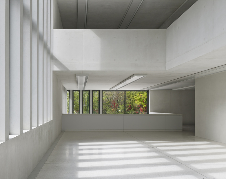 Großformatige, in den Kubus eingeschnittene Fassadenöffnungen werden durch vertikal eingestellte Betonlamellen strukturiert, die den Baukörper plastisch gliedern, ohne dessen klare Geometrie zu beeinträchtigen. Die Fenster ermöglichen jeweils über die Gebäudeecken fokussierte Ausblicke auf die umgebende Topographie. Gleichzeitig bilden sie die innere Struktur zweigeschossiger Lufträume nach außen hin ab. Innen wie außen ist der Bau geprägt durch das dominierende Material Weißbeton, einem mit Weißpigment und weißem Sand hergestellten Transportbeton, in dem das Gebäude vollständig über die tragenden Kerne und Fassaden und die Deckenplatten und Fußböden konstruiert ist. Die roh belassene Konstruktion prägt das äußere Erscheinungsbild und wird gleichermaßen zum Passepartout für die inneren Nutzungen, insbesondere für die Ausstellungsarchitektur.