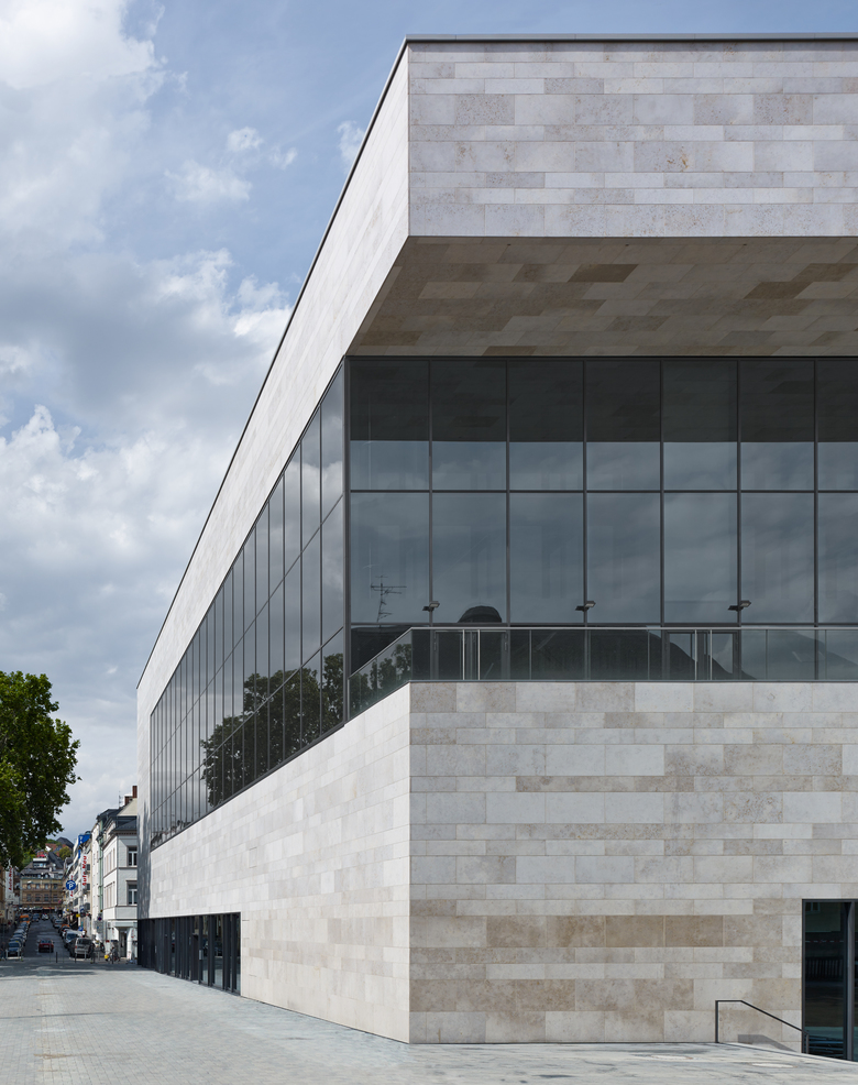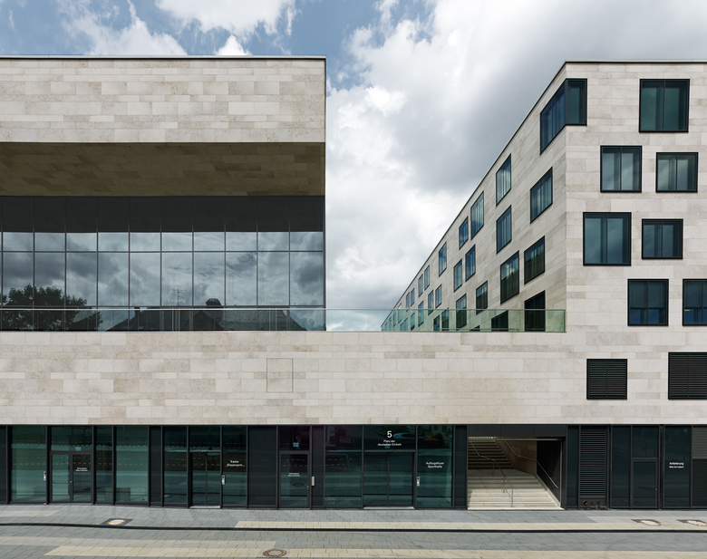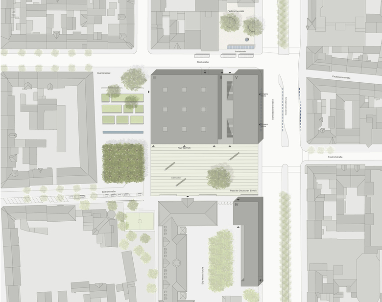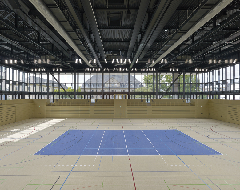 Die neue Sporthalle ist sowohl inhaltlich als auch städtebaulich in engem Zusammenhang mit der bestehenden Elly-Heuss-Schule zu betrachten, welche nun in die erste Reihe tritt und mit ihrem kräftigen Kopf- und Eingangsgebäude ein stadträumlich prägendes Element des Platzes der Deutschen Einheit bildet. Die geplante Ausbildung als Wettkampfstätte für sportliche Veranstaltungen mit entsprechenden Tribünenanlagen erfordert eine räumliche Verknüpfung mit dem Platz und eine über das übliche Maß hinausgehende Ausstrahlung des Sportgeschehens in diesen neuen Stadtraum hinein. Dies wird mit einer großzügigen Öffnung der Sporthalle zum Platz der Deutschen Einheit hin erreicht. Einzelhandelsflächen und Gastronomieeinrichtungen wie Cafés und Restaurants befinden sich in der Erdgeschossebene.