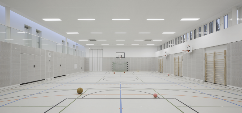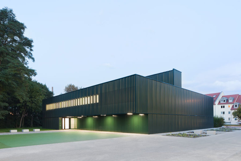 Die Sporthalle an der Franz-Mehring-Schule ersetzte einen baulich stark abgenutzten Vorgängerbau. Mit den knappen finanziellen Mitteln aus dem Konjunkturpaket II entstand ein kompakter Baukörper, der durch präzise Gestaltungselemente einen neuen Identifikationspunkt auf dem heterogenen Schulgelände erzeugt. Die Einfeldhalle spiegelt die verdichteten Parameter der Bauaufgabe wider: größtmögliches Raumprogramm, minimaler Freiflächenverbrauch und hohe energetische Anforderungen.