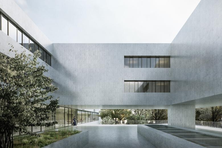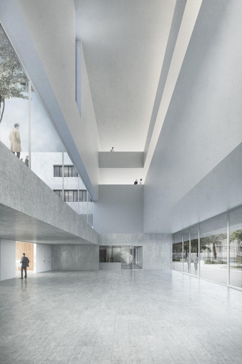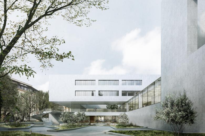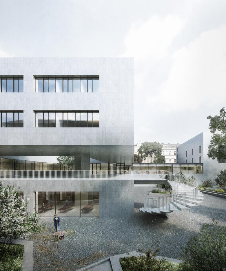 Der Sitz der Deutschen Botschaft in Wien ist ein ungewöhnlicher Ort. Inmitten der dichten Bebauung des 3. Bezirks gelegen, wird er von einem großzügigen Grünraum umrahmt. Unser Entwurf überzeugte das Preisgericht, weil „die offene ‚Beletage‘ den bestehenden Park mit den Räumen der Botschaft verwebt. Es entsteht ein neuer Typus eines offenen, mit seiner Umgebung in Dialog tretenden Hauses, welches die gegebenen Sicherheitsanforderungen nicht zum Ausdruck der Architektur werden lässt“ (Juryprotokoll).