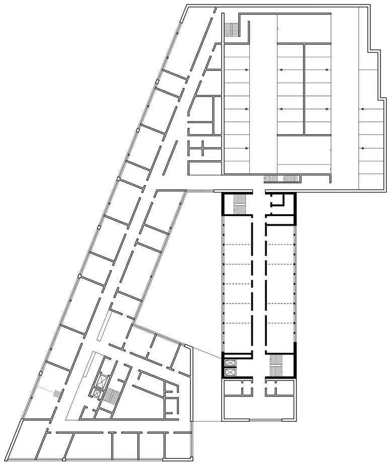 Die Fassaden sind aus über 55.000 eloxierten Metallschindeln gefügt, die Bestand und Neubau gleichermaßen wie ein maßgeschneidertes Kleid umhüllen. Das „Schnittmuster“ generiert ein übergeordnetes Fassadenraster von 34 auf 34 Zentimetern, das präzise Bezugnahmen des Neubaus auf den Bestand zulässt. Die Produktion der Schindeln wurde durch eine Behindertenwerkstatt in Thüringen umgesetzt und ausschließlich in Handarbeit realisiert.