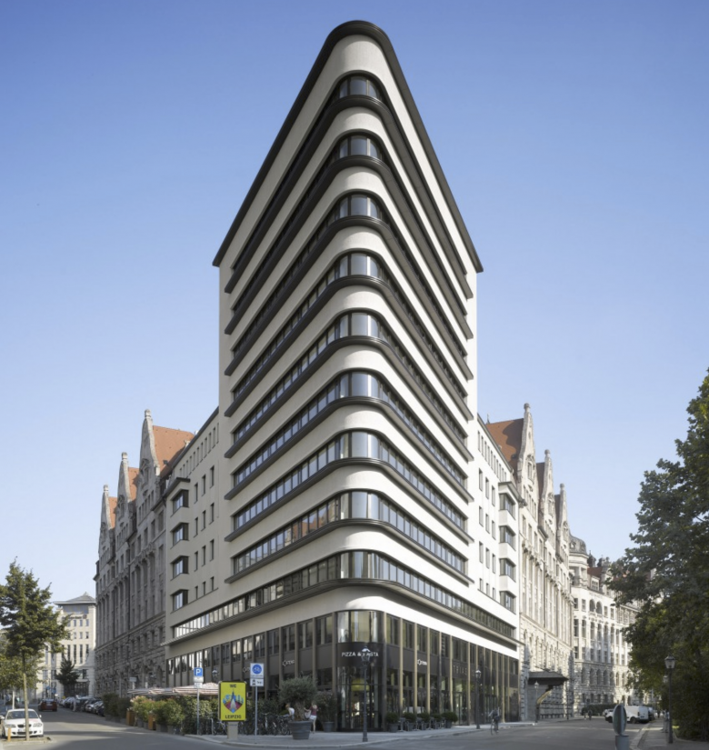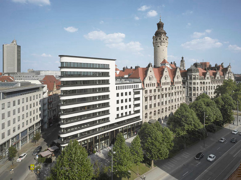 Die selbstverständliche Prägnanz des TRIAS Hochhauses resultiert aus der architektonisch sensiblen Bezugnahme auf den historischen Bestand des Neuen Rathauses und Stadthauses. Die Gesims- und Traufhöhen der Altbauten wurden aufgenommen und fanden in der plastischen Fassadengestaltung des Neubaus eine Entsprechung. Die Ecke des Blocks wird gegenüber der Nachbarbebauung um drei Geschosse überhöht und erzeugt eine markante Adresse sowie architektonische Eigenständigkeit entlang der „Ringfassade“.