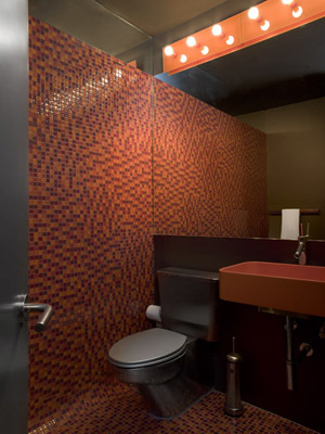 In contrast to the dematerialized ocean view, the view towards the interior side of the apartment emphasizes solidity and material presence. The materials become less reflective and richer in texture and color. Dark natural rosewood paneling, warmer (red, orange and brown) colors, mosaics and flat finishes provide a solid physical anchor to the bright ephemeral finishes on the ocean side.