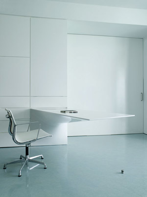 The desk was designed to cantilever from the wall and is anchored to a floor-to-ceiling steel column embedded in the millwork.