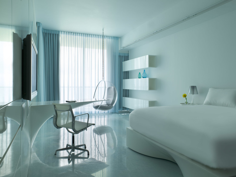 Translucent and slightly iridescent curtains bring the blue into the apartment and allow varying levels of privacy/screening. The glossy white finish on the two transformable walls allows the reflections of the ocean views to dematerialize these perpendicular boundaries somewhat- joining the interior to the exterior.