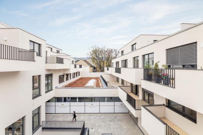 Zwischen diesen beiden unterschiedlichen Atmosphären befindet sich eine halb öffentliche Hofzone, die sowohl von BewohnerInnen der Anlage als auch von externen BesucherInnen genutzt werden kann. Parkmöglichkeiten bietet die Garage in den Untergeschossen der Gebäude.