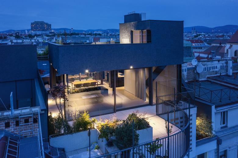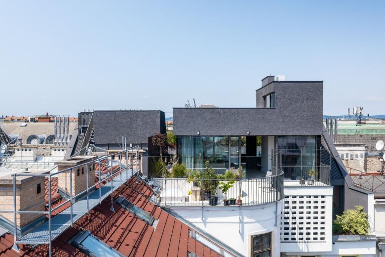 In a Viennese residential building constructed around 1900, two additional separate residential units were to be created in the course of an attic conversion. Our goal for this project was to create as many open spaces and terraces as possible while at the same time ensuring maximum privacy for the two residential units.