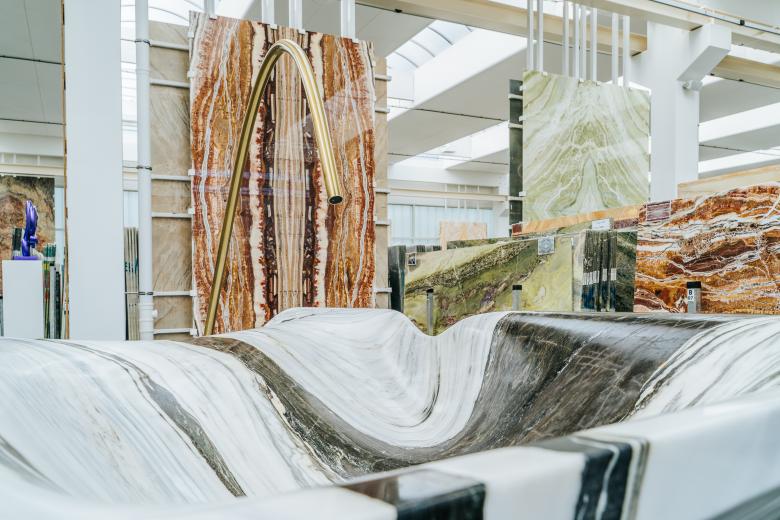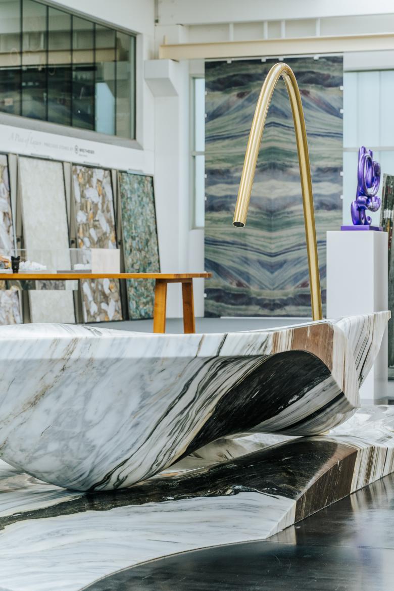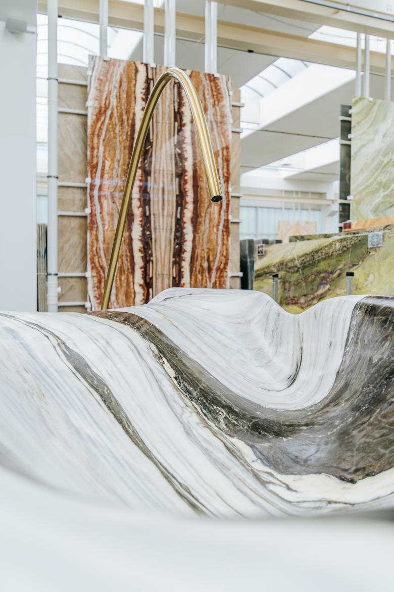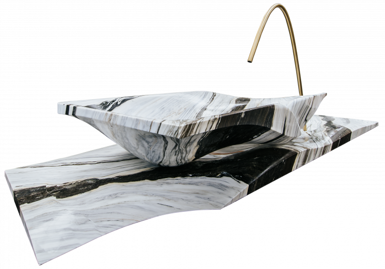 Dieselben Kräfte prägen nun auch die fließenden Formen des Designs der Wanne, formen Schluchten, Klippen und Aushöhlungen holen die Seele des Steins an das Tageslicht. Die weichen Rundungen im Stein sorgen für außergewöhnliche Wassermomente. Fließende Übergänge, Hügel und leichte Höhenunterschiede unterstreichen die Verbindung der Skulptur mit ihrer Funktion – dem Auffangen, Sammeln und Fließen von Wasser durch eine artifizielle Landschaft.