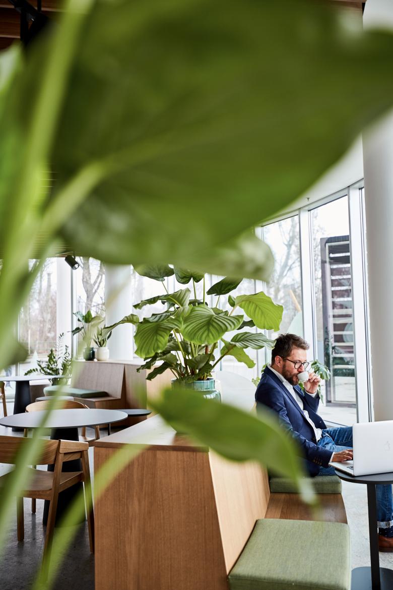 Die Kantine erweitert ihre Flächen in die Natur. Im Innenhof wird eine mit Holz verkleidete Terrasse für die Kantine errichtet. Als Grün-Oase für Mitarbeiter wurde der Innenhof mit Bäumen und Pflanzen aller Art bepflanzt und fügt sich zu einem erholsamen Außenbereich zusammen. Zusätzliche Beschattungselemente bieten an heißen Sommertagen einen Ort für Gespräche und Pausen.