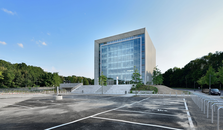Das Gebäude liegt auf einem weithin sichtbaren Gelände und bildet das Tor zum Campus. Der kubische, siebengeschossige Baukörper ist freigestellt auf einem Plateau positioniert und stellt einen zeichenhaften Solitär dar, der mit einer metallisch glänzenden Gebäudehülle überzogen ist.