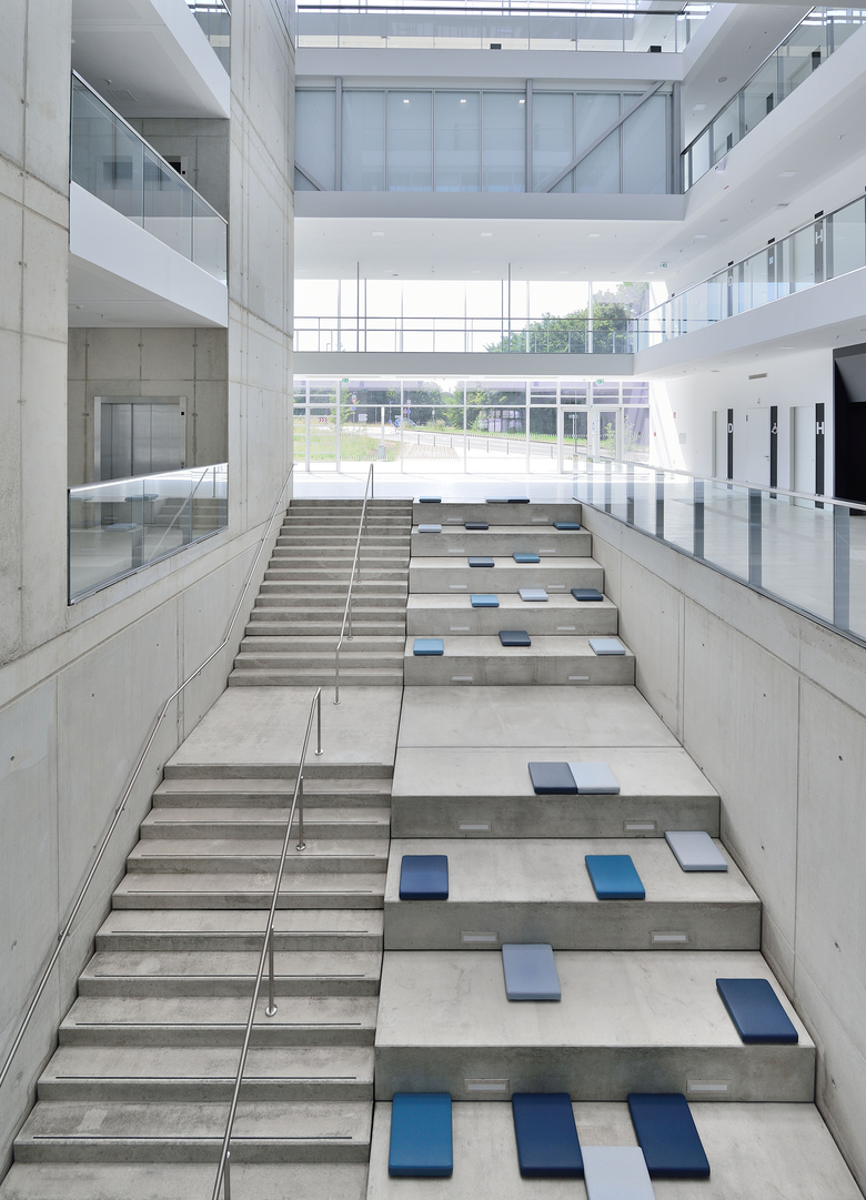 Innerhalb des rund 30 Meter langen Kubus befindet sich ein Atrium, das durch zahlreiche Brücken, breite Galerien und großflächige Lernbereiche eine offene und kommunikative Welt der Lehre und Forschung entstehen lässt. Sitzgruppen mit speziellen Akustikstoffen, mobile Hocker und elektri-fizierte Raumtrenner stehen in den Lernbereichen für Meetings oder konzentriertes Arbeiten zur Verfügung.