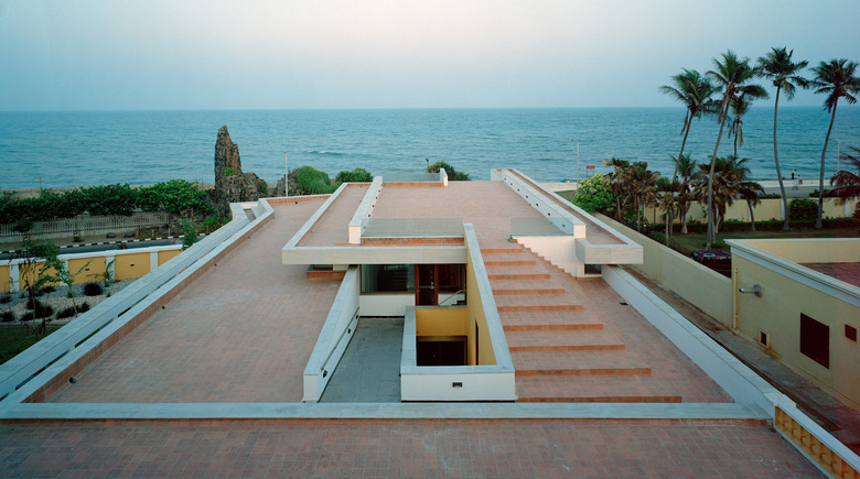 The central axis was extended to the seashore and offers transparency from the entrance court to the sea through 90 m of built masses and courtyards. The lay with the internal floors are spit levels to give several views of the garden and horizon line of the sea.