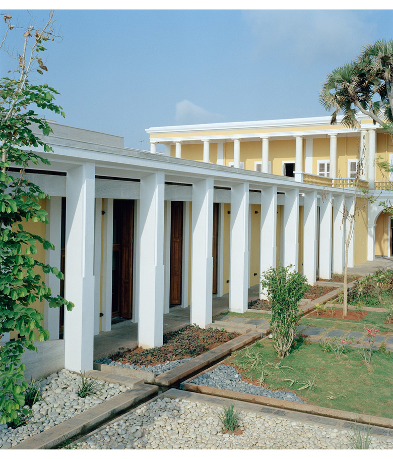 The existing building, facing the Indian Ocean, is one of the most remarkable structure of the french part of the city. The plan is based on a typical XVIIIth century "hotel particulier, entre cour et jardin "plan with a axis, symmetry & the center and small transparency between courtyard and garden, large rooms in on the sides. The concept was to reinterpret these composition rules and scale for a contemporary project.