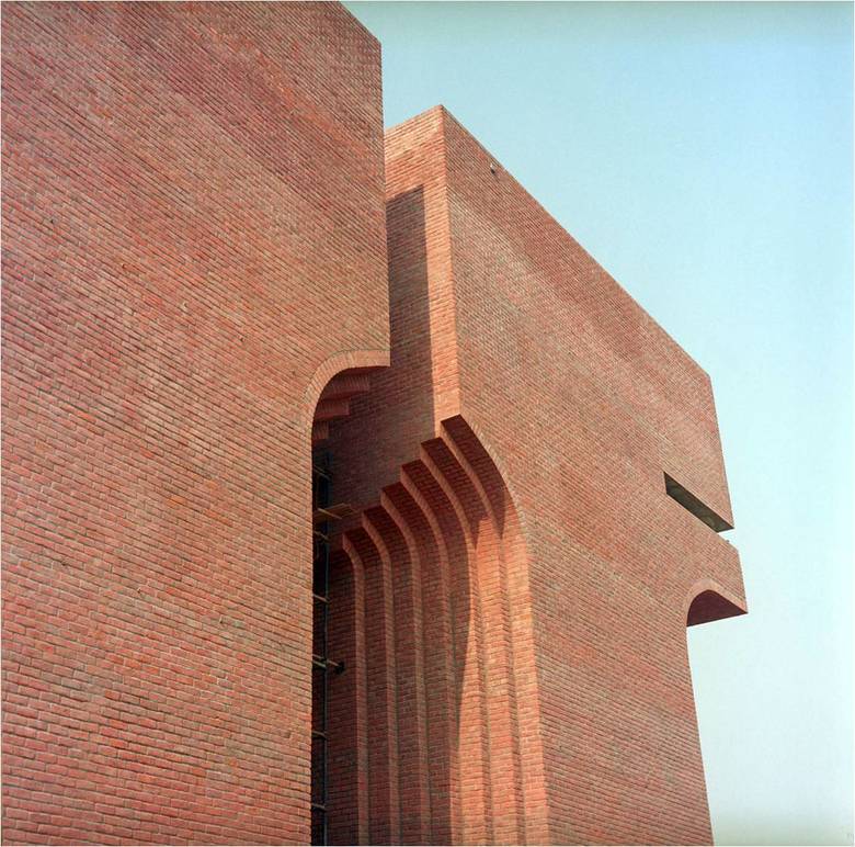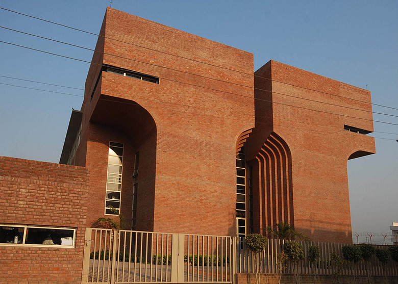 The arched shape of the structure is inspired by the mughal monuments of Delhi, reinterpreted into a contemporary design. The entrance is an entre-deux created out of a vault open in the center between the 2 T shaped pillars, the logo. of the company.