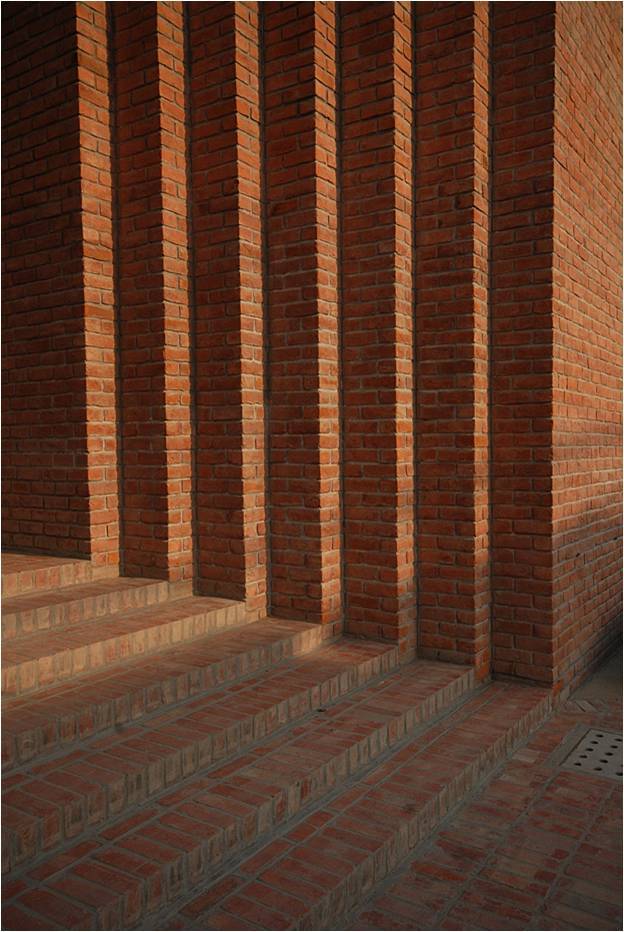 It will be a RCC Structure using large mushroom columns and flat slabs above them, offering beam ridden working space offices with good height. The main studio areas will get a double height space with The one side of the hall looking from below, at the hanging gardens on the either side of the courtyard. The project will use only exposed bricks for external facade giving the precinct a warm character.