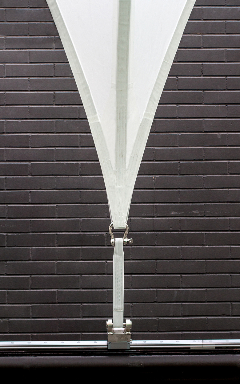 Das faltbare Membrandach erstreckt sich über eine 50m lange Gasse im Herzen der Stadt Buchs, Schweiz. Im aufgespannten Zustand nimmt die Dachhaut eine sehr räumliche, wellenförmige Geometrie ein. Das textile Gewebe ist zwischen bogenförmige Grat- und Kehlgurte gespannt und bildet so eine Abfolge dynamischer Elemente mit einer mittleren Höhe von 6,50m über dem Straßenniveau. Die zusammengefaltete Membrane wird am nördlichen Ende unter einem Schutzdach geparkt, das zwischen den Gebäuden ein Tor zur Metzgergasse bildet. Während des Auffahrens wird die Membrane gleichzeitig auch in Querrichtung gegen Windlasten räumlich vorgespannt. Die maßgebenden Windlasten für die Dachkonstruktion wurden durch Versuche im Windkanal speziell ermittelt. Die Membrane wurde aus einem PTFE-Gewebe konfektioniert, das optisch und qualitativ höchsten Anforderungen entspricht.