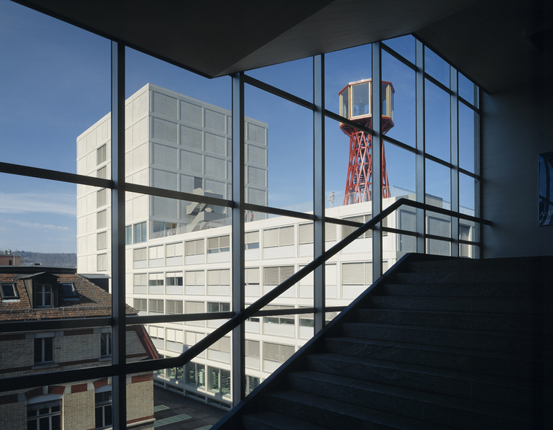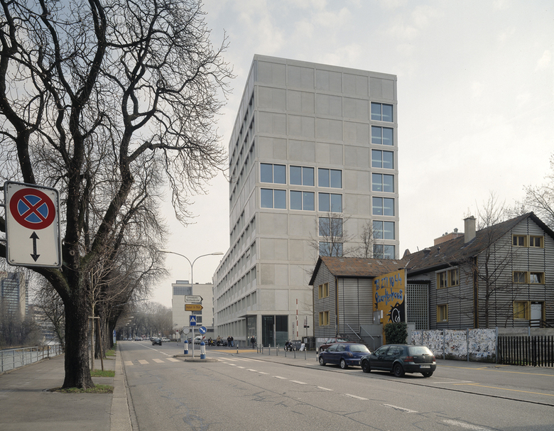 Die Technische Berufsschule Zürich (TBZ) musste im Zuge des Gestaltungsplans Zürich-Nord ihr Schulgebäude in Zürich Oerlikon aufgeben. Am Sihlquai sollte ein Neubau in unmittelbarer Nähe zum Hauptgebäude der TBZ Ersatz bieten. Stücheli Architekten gingen1997 aus dem international ausgeschriebenen Wettbewerb des Kantonalen Hochbauamts als Sieger hervor. Um das Bauvolumen von rund 3000 m3 in die Topografie einzufügen, wählte man einen L-förmigen Baukörper. Der niedrige Gebäudeteil übernimmt die Höhe des angrenzenden Stammhauses, während der Turm die benachbarten Bauten um sechs Geschosse überragt. Damit ergänzt der Neubau die Reihe der markanten Gebäude entlang des Flussraums und verweist auf seine öffentliche Nutzung. Die Erschliessung erfolgt hauptsächlich von der Ausstellungsstrasse her; ein zweiter, städtebaulich übergeordneter Eingang gewährt allen ausserschulischen Nutzern am Sihlquai Einlass. Die einem strengen Raumgitter folgende Grundstruktur des Gebäudes wird auf der Fassade sichtbar, als feines Netz aus Stützen und Sturzbändern. Funktionale Ausfachungen – vorgefertigte Decken-, Wand- und Fensterelemente – fügen sich in die massiven Rahmen ein und verleihen dem Bau eine zurückhaltende Eleganz. Die reduzierte Formensprache setzt sich im Inneren fort: Stützen strukturieren den Raum und lassen einer zukünftigen Nutzung maximalen Spielraum. Die Materialisierung orientierte sich an der Bedeutung der Räume – für die Erschliessungszonen wurden harte Materialien wie Beton und Kunststein verwendet, für die Unterrichtsräume weiche Oberflächen wie Holz, Tapeten und Kautschuk. Das Gebäude ist Minergie-zertifiziert, Heizung und Warmwasseraufbereitung für die rund 7‘000 m2 Nutzfläche erfolgen über eine durch Gasfeuerung ergänzte Wasserwärmepumpe.