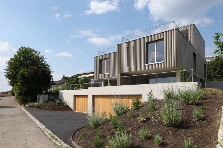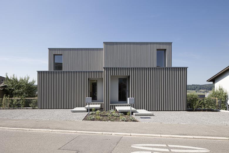 Am Sattelbogen, in einem Wohnquartier an peripherer Lage von Wohlen entstand dieses Wohnhaus für zwei Familien. Die bis anhin unbebaute Parzelle liegt in einem ruhigen Wohnquartier mit heterogener Bebauung aus den 50-er bis 90-er Jahren an schöner Südwest-Hanglage mit Aussicht über das Bünztal.