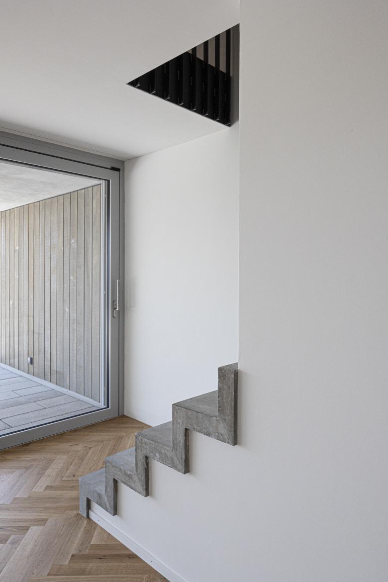 Die Geschosse werden mit einer dem Hang folgenden Kaskadentreppe miteinander verbunden. Das Gartengeschoss umfasst neben dem Wohnbereich einen zweigeschossigen Essbereich mit Küche und ein Gästezimmer mit eigenem Bad. Dem Wohnbereich vorgelagert ist ein grosser gedeckte Sitzplatz.