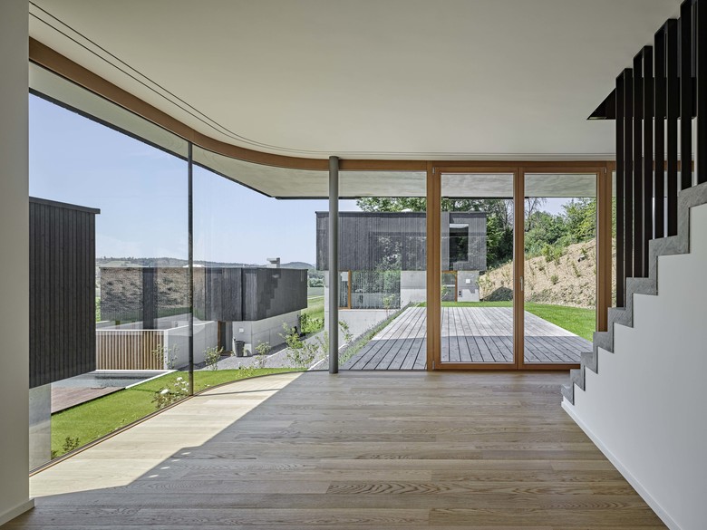 Optional sind die Gärten im Anschluss an die Holzterrassen mit einem Schwimmbecken in Beton ergänzt. Die Gartengeschosse sind in Sichtbeton ausgeführt, die Obergeschosse mit teilvorfabrizierten Holzelementen und einer hinterlüfteten vertikal angebrachten Holzfassade verkleidet. Sonnen- und Wetterschutz bilden automatisierte Schiebeläden mit analoger Holzverkleidung und offener Fugenausbildung.