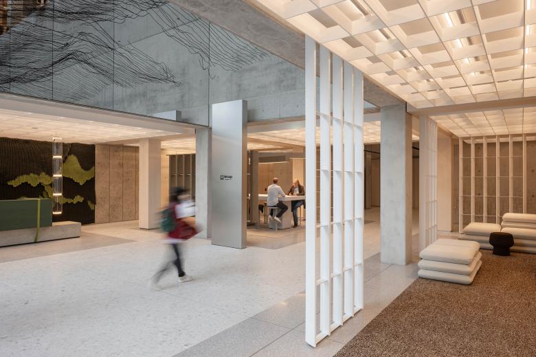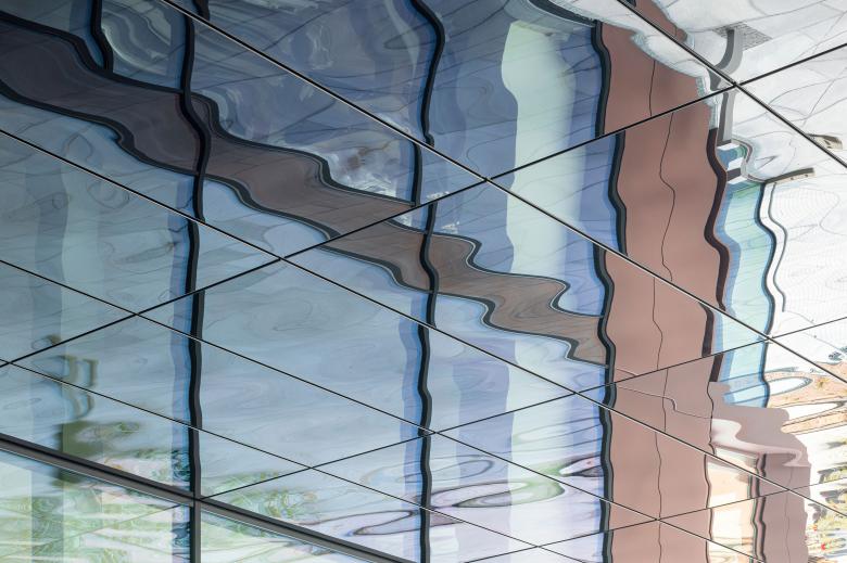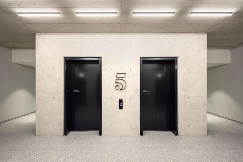 Die unteren beiden Geschosse des Verbindungsbaus fungieren als ein offener, stützenfreier Durchgang. Die Decke des Durchgangs ist mit verspiegelten Edelstahlblechen in Onyx Black versehen, die fließende Reflektionen entstehen lassen – eine Hommage an den Standort des Ensembles direkt am Wasser.