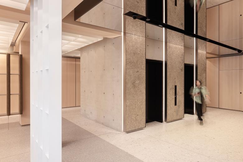 Das Interior der Lobbies, die Marketingsuite sowie das Leitsystem wurden von der Ippolito Fleitz Group entworfen. Die Kunstinstallation unter den Decken der Lobbies stammt von Julius von Bismarck und trägt den Titel „Die Luft muss man sich wegdenken”. Die Kunstobjekte aus Nylon hinter den Empfangstresen stammen vom koreanischen Künstler Kwangho Lee.