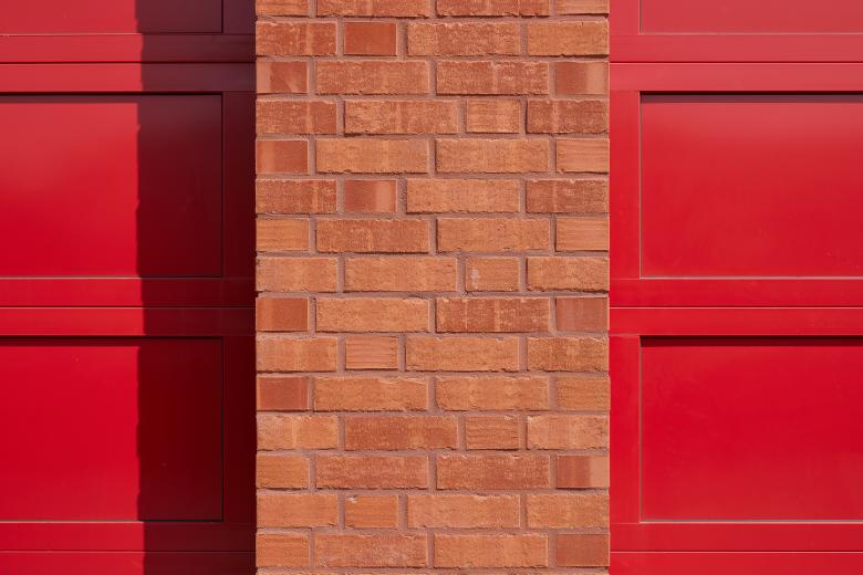 Für die Fassade wurden Klinker im Normalformat der Farbe aquaterra Salinagrau gewählt. Die wesentlichen Öffnungen des Gebäudes wie die Feuerwehrtore und der Haupteingang mit Schulung sowie der Alarmeingang wurden mit rotem Klinker eingefasst und zeigen einen metallisch roten Kern.
