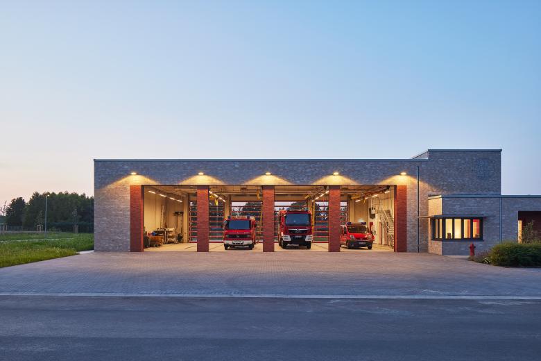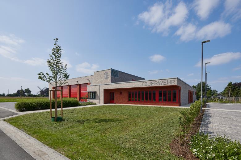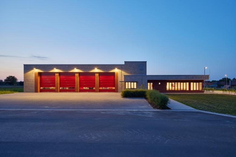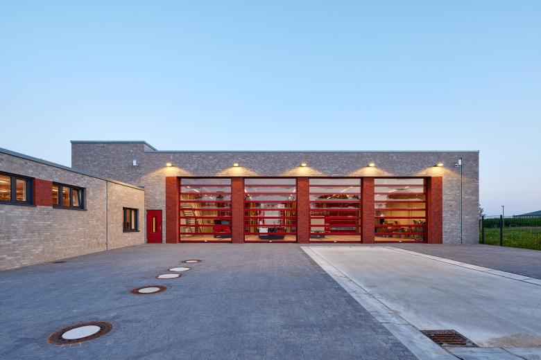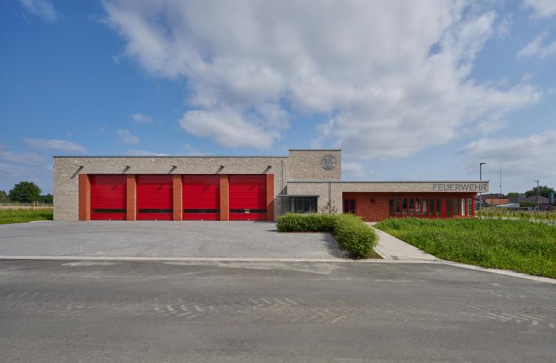 Auf dem Gelände am Schafweg des Ortsteils Wemb der Gemeinde Weeze in Nordrhein-Westfalen wurde ein neues Feuerwehrgerätehaus für die regionale Löschgruppe der freiwilligen Gemeindefeuerwehr errichtet, das aus zwei flachen Baukörpern besteht, die sich um knapp fünf Meter verschneiden. Durch die gemeinsame, graue Klinkerfassade bilden die Neubauten wieder eine Einheit. Der Entwurf erhielt den 1. Preis im ausgeschriebenen Architektenwettbewerb.
