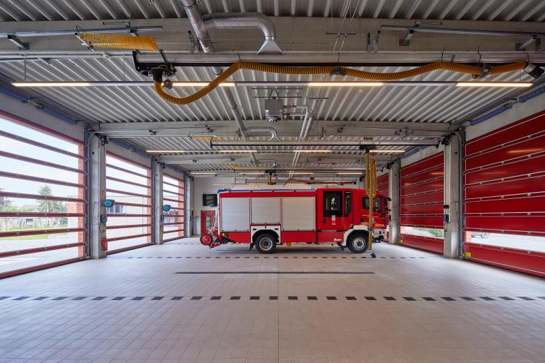 Die erste Kubatur des Gesamtgebäudes ist eine rund 320 m² und 5,75 m hohe Halle für Feuerwehrfahrzeuge. Rechtwinklig schließt sich an diese das Feuerwehrhaupthaus an, ein Sozialtrakt mit Umkleiden und Schulungsraum. Eine Werkstatt und zusätzliche Lagerräume runden das Raumprogramm des Feuerwehrgerätehauses ab. Die Technikräume sind im 1.Obergeschoss oberhalb des Haupthauses angeordnet.