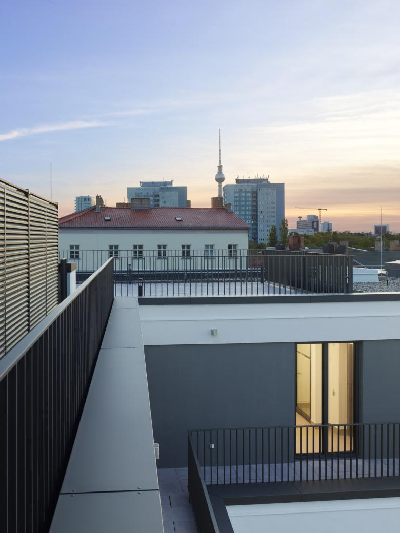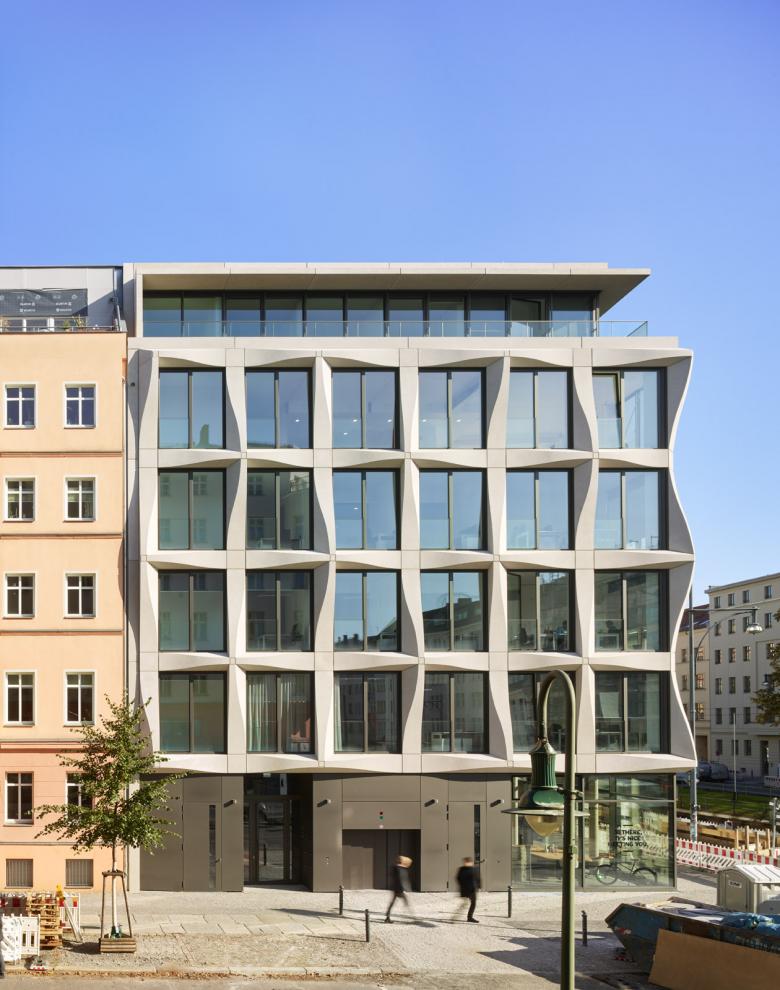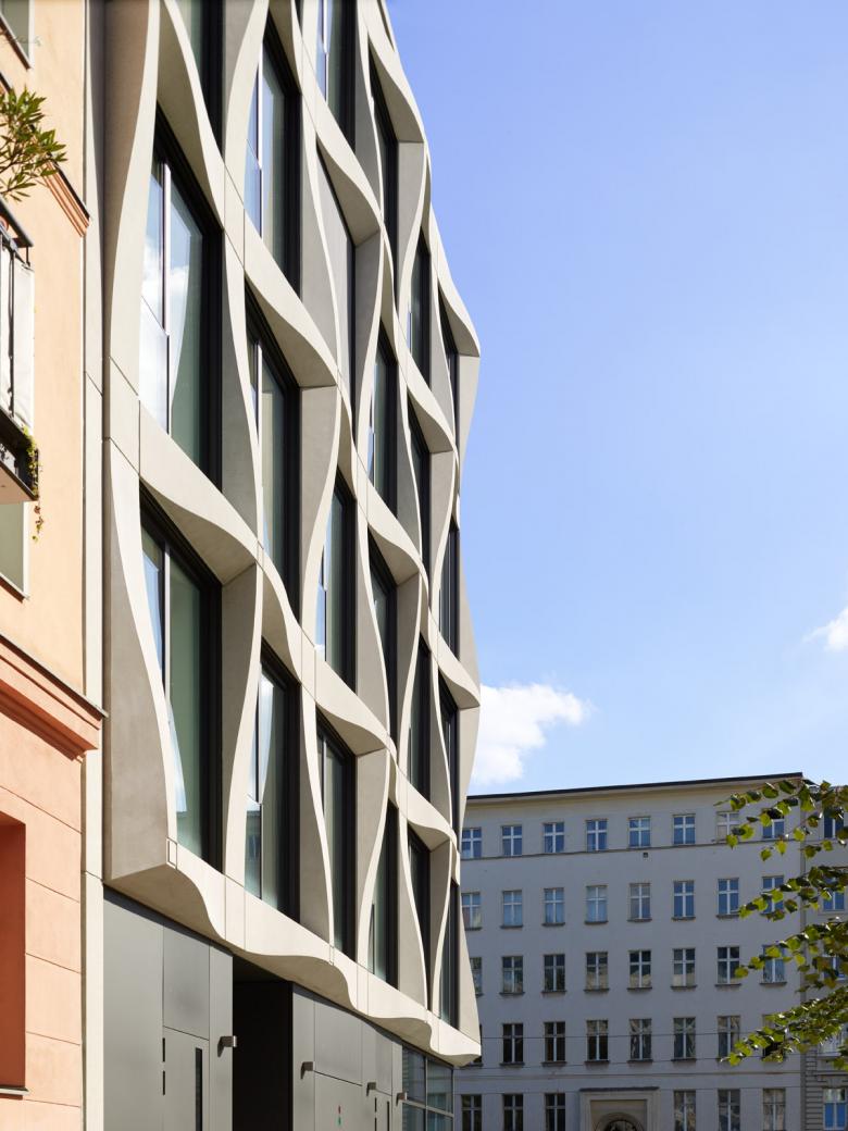 Auf dem rund 464 m² großen Eckgrundstück zwischen Greifswalder Straße und Heinrich-Roller-Straße im Berliner Bezirk Pankow, Ortsteil Prenzlauer Berg, entstand ein Büroneubau, dessen expressiv-lebhafte Hauptfassade mit ihrer geschosshohen, quadratischen Gitterstruktur aus hellen Architekturbeton-Fertigteilen sofort ins Auge fällt.