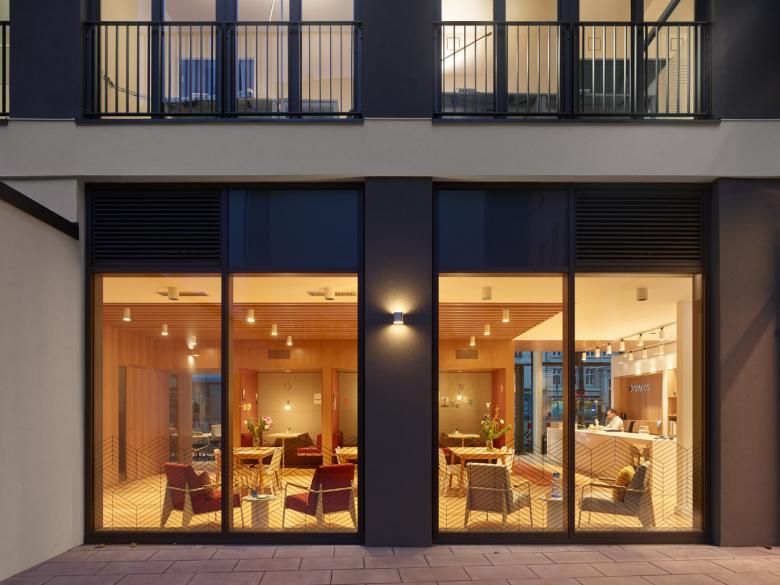 Der Baukörper umfasst sechs Vollgeschosse, die pro Mieteinheit als flexible Kombinationen aus Großraum-, Einzelbüros, Konferenz-, Meetingräumen und Coworking-Spaces genutzt werden können. Im Erdgeschoss befindet sich eine Büroeinheit mit Besprechungsbereichen und Open-Space – Arbeitsplätzen. Das oberste, fünfte Geschoss ist straßenseitig um ca. 1,60 m zurückgestaffelt, die Dachfläche, die über das 5. OG erschlossen wird, ist begrünt und teilweise als Dachterrasse ausgebildet. Das Untergeschoss ist für PKW-Stellplätze, Fahrradstellplätze und Technikräume vorgesehen.