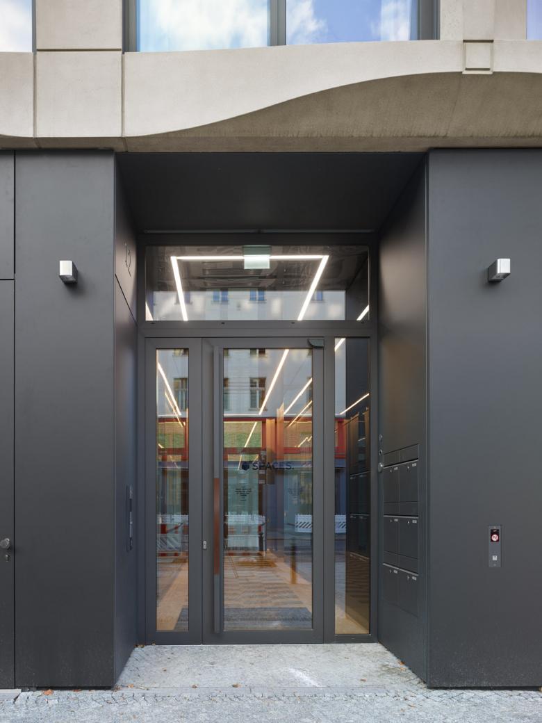 Der als modernes Büro-Business-Center genutzte Neubau folgt straßenseitig der Bauflucht und schließt unter Einhaltung der Abstandsflächen im Hof und unter Ausnutzung der maximalen Bebauungstiefe an die Brandwände der Nachbargebäude an. Um die Abstandsflächen einzuhalten, besitzen das 4. und das 5. Obergeschoss hofseitig ebenfalls Rückstaffelungen. Alle Neubauteile schließen mit Flachdächern ab.
