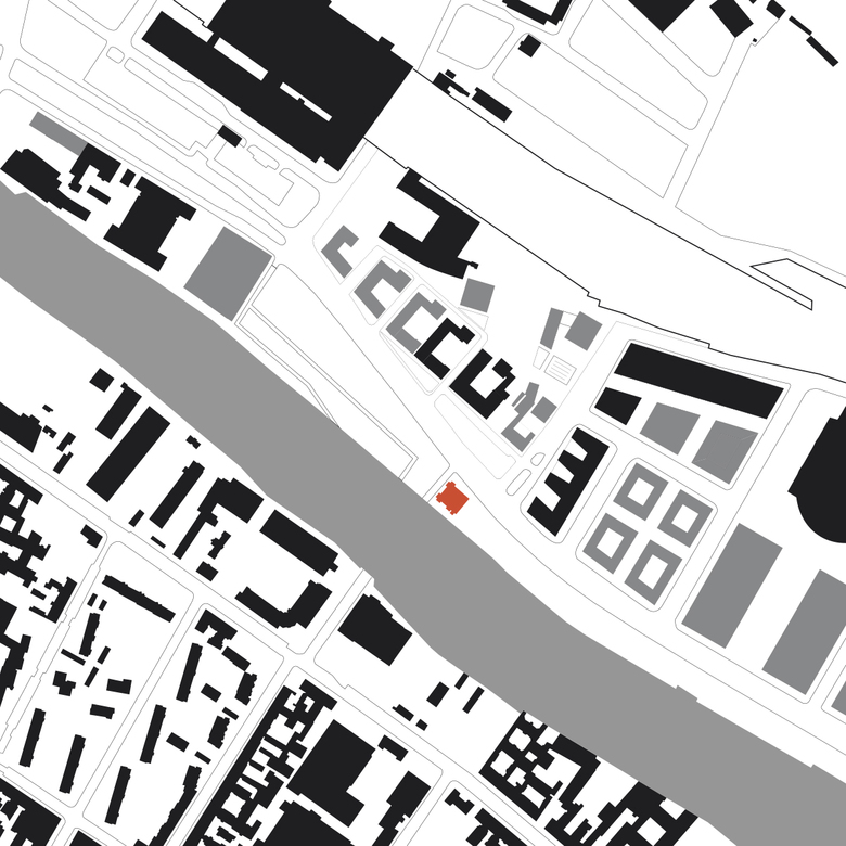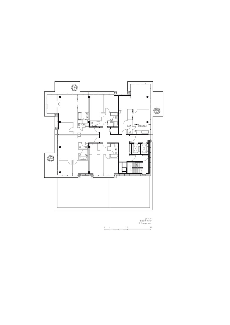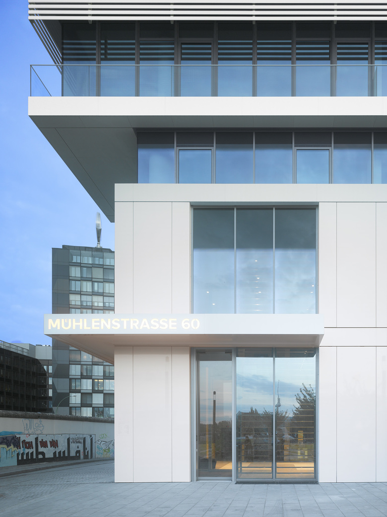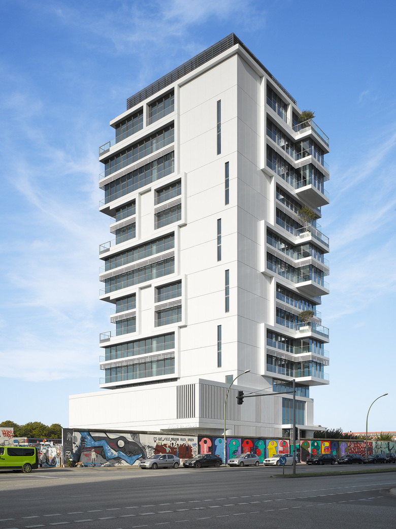 Mit dem Wohnhochhaus fand gleichzeitig eine Erweiterung der Nutzungsbandbreite am Spreeufer statt. Der weiße Solitär befindet sich am Brückenkopf der ehemaligen kriegszerstörten Brommybrücke und damit unmittelbar am Wasser. Skulptural geformt lebt der Wohnturm von der Rotation der aufeinander geschichteten Blöcke. Von allen Standpunkten aus betrachtet sorgt das Relief mit seinem Wechsel zwischen ausgehöhltem Volumen und den Auskragungen für ein visuelles Spannungsmoment.