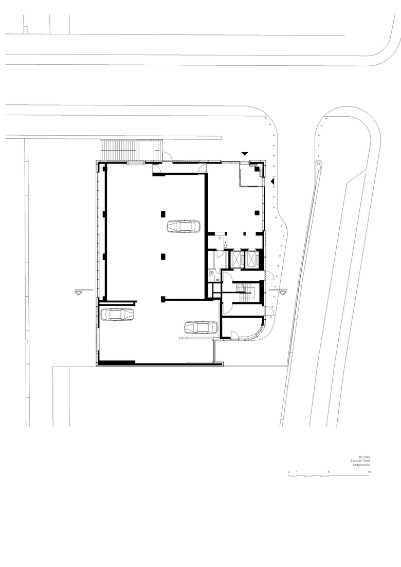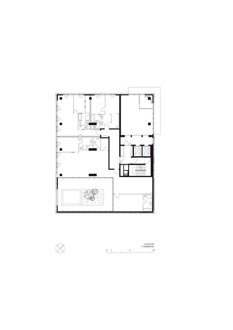 Im Kellerbereich befinden sich haustechnische Erschließungs- und Technikflächen, der Müllsammelraum, ein Fahrradabstellraum, Wohnungsabstellräume und ein Lager. Die Erschließung des Gebäudes erfolgt über eine Doppelaufzugsgruppe, von denen einer als Feuerwehraufzug fungiert.