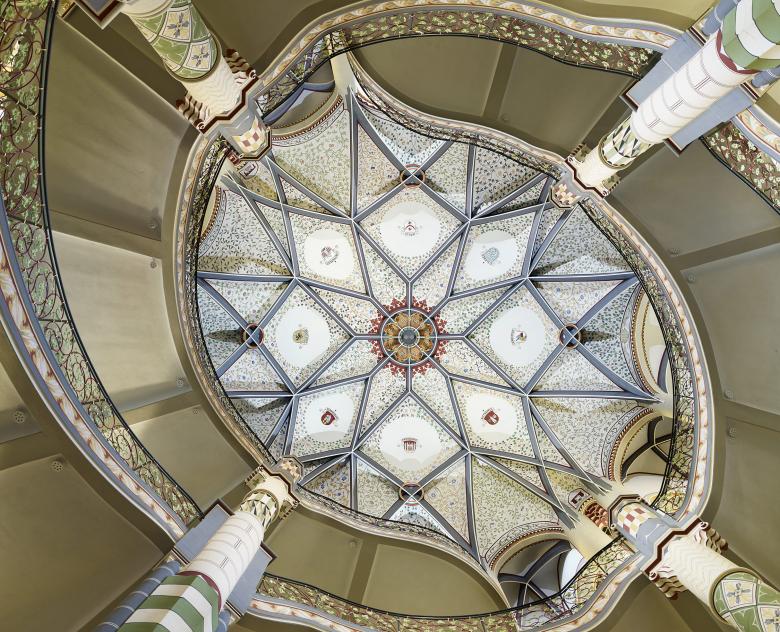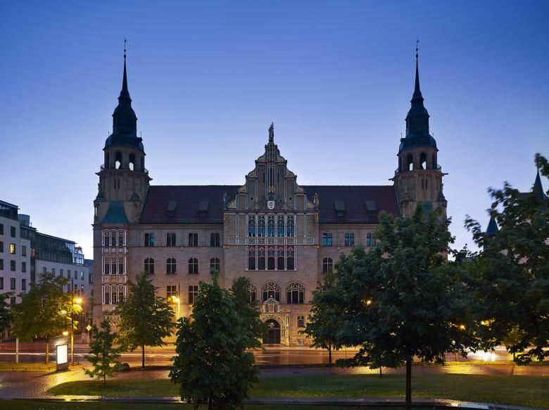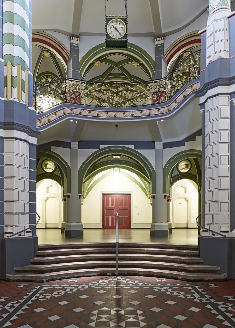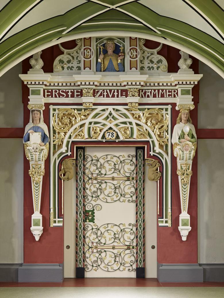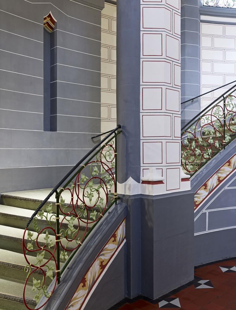 Erscheinungsbild außen und in ausgewählten Bereichen innen wiederherzustellen. Der Fokus lag einerseits auf der Wiederherstellung der Fassaden, Fenster und Türen sowie auf ausgewählten öffentlich zugänglichen Räumen, insbesondere auf dem Eingangsbereich und dem Haupttreppenhaus, den Treppenhäusern, Fluren und einigen Verhandlungsräumen.