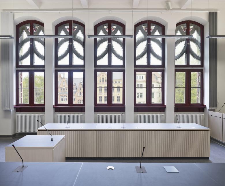 Sanierung mit Neu-, Um- und Erweiterungsbauten, Wiederherstellung des bauzeitlichen Erscheinungsbildes unter Berücksichtigung aktueller Anforderungen an eine zeitgemäße Justiz mit moderner Daten- und Kommunikationstechnik und sicherheitstechnischen Anforderungen. Das Gebäude ist ein Baudenkmal, zugleich ist es Teil eines Denkmalbereiches.