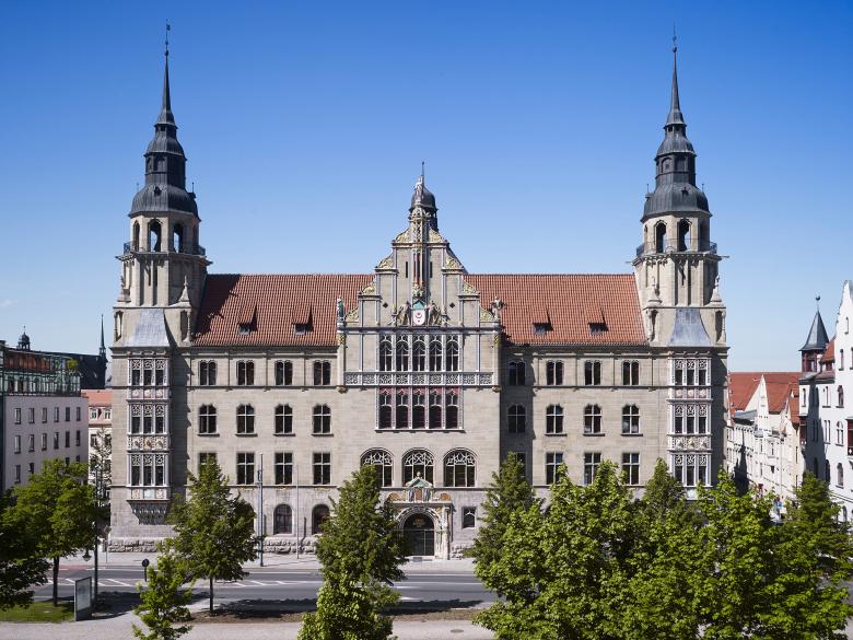 Das Gerichtsgebäude in Halle wurde zwischen 1901 und 1905 als mächtiger, das Stadtbild prägender viergeschossiger Bau errichtet. Innen und außen befinden sich zahlreiche Bauverzierungen im Stil der späten Gotik und Frührenaissance. Das Haupttreppenhaus ist als steile, gewölbte Kuppelhalle gestaltet. Dieses Baudenkmal zählt zu den aufwendigsten und architekturgeschichtlich bedeutendsten Justizpalästen der Wilhelminischen Zeit. Zugleich ist es ein Teil eines städtischen Denkmalbereichs. Ursprünglich als Zivilgericht errichtet, wird der Gebäudekomplex heute als Landgericht genutzt.