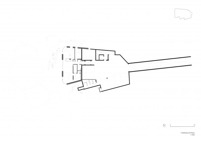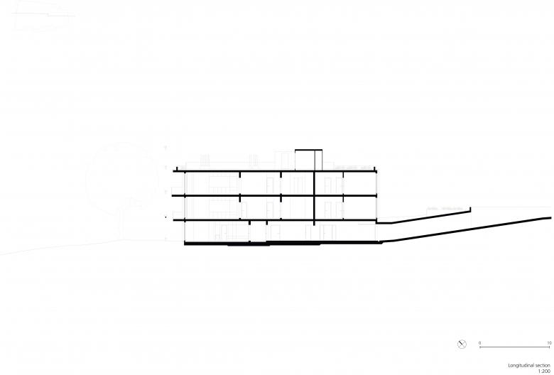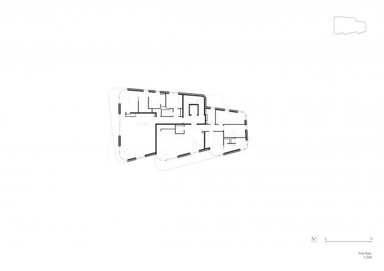 Das Gebäude orientiert sich volumetrisch an der Geometrie des Grundstücks und weitet sich ebenfalls in Uferrichtung auf. Die Form des Gebäudes ist mit schwungvollen Rundungen abgestuft, welche dem Baukörper eine optische Gliederung verleihen. Die Höhe des Gebäudes sowie die Anordnung der Etagen