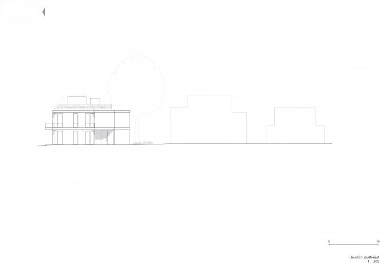 Die Räume im Gartengeschoss erhalten direkten Zugang über eine außenliegende Treppenanlage an der nord-östlichen Gebäudekante. Alle weiteren Wohnbereiche werden über das zentrale Treppenhaus im Haupteingang erschlossen. An die Aufenthaltsräume schließen großzügige Terrassenflächen an. Darüber hinaus ist der größte Teil des Flachdachs der Terrassennutzung vorbehalten, teilweise als Dach mit intensiver Begrünung und teilweise als Holzdeck ausgeführt.