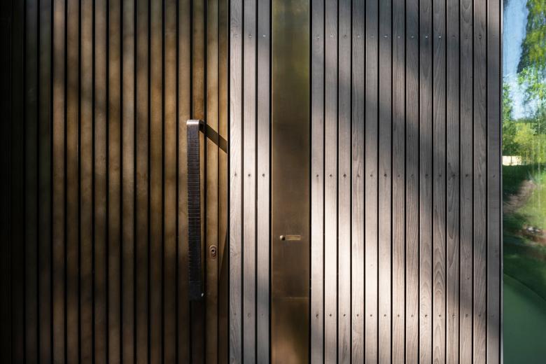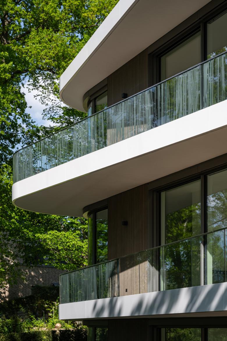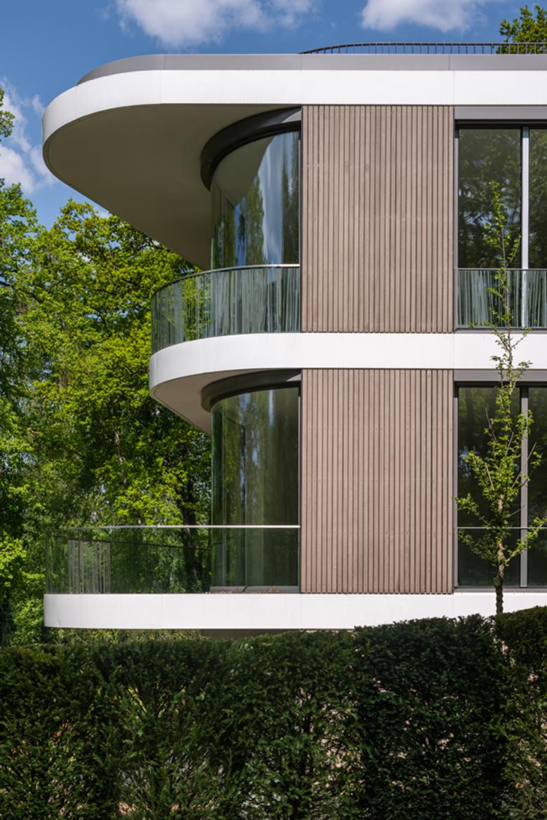 Die hinterlüftete Holzfassade aus Rhombusleisten in lasierter Thermoesche strukturiert die Fassade vertikal. Horizontal wird die Fassade durch weiße, witterungsbeständig beschichtete Metallblechbänder unterteilt. Die ausdrucksvollen Fensterrundungen und ausladenden Balkone akzentuieren die Fassade und Gebäudeform zusätzlich, ermöglichen großzügige Blickbeziehungen auf den Griebnitzsee und holen die umliegende Natur in das Innere des Gebäudes. Öffenbare bodentiefe Aluminium-Blockfenster sorgen für lichtdurchflutete Innenräume. Die Balkone sind ab dem Gartengeschoss mit absturzgesicherten Glasbrüstungen versehen, deren Streifenmuster mit der vertikalen Strukturierung der Holzfassade korrespondiert. Die Süd-, Ost- und Westfassade verfügt über einen motorisch gesteuerten textilen Sonnenschutz als Vertikalmarkise.