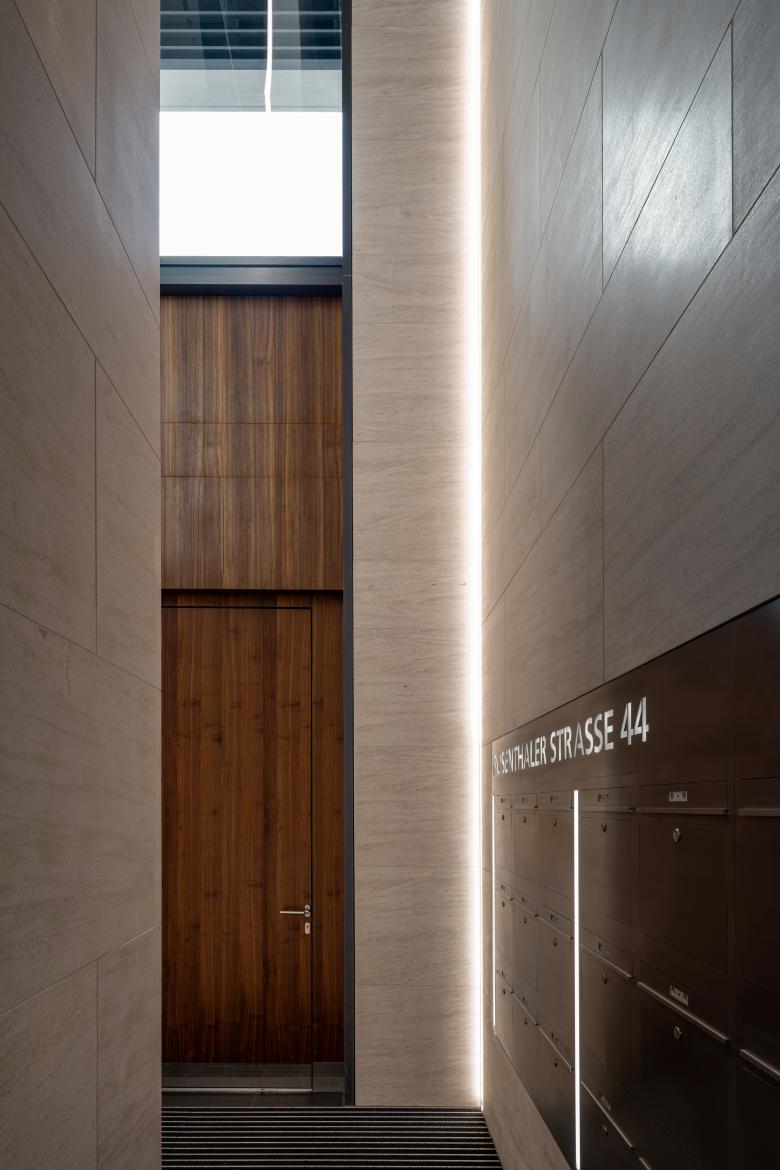 Das Staffelgeschoss im sechsten Obergeschoss besitzt Dachterrassen, die durch rahmenlose Ganzglas-Sichtschutzelemente voneinander getrennt sind. Die zwei hofseitigen Dachterrassen präsentieren sich zudem mit begrünten Pergolen.