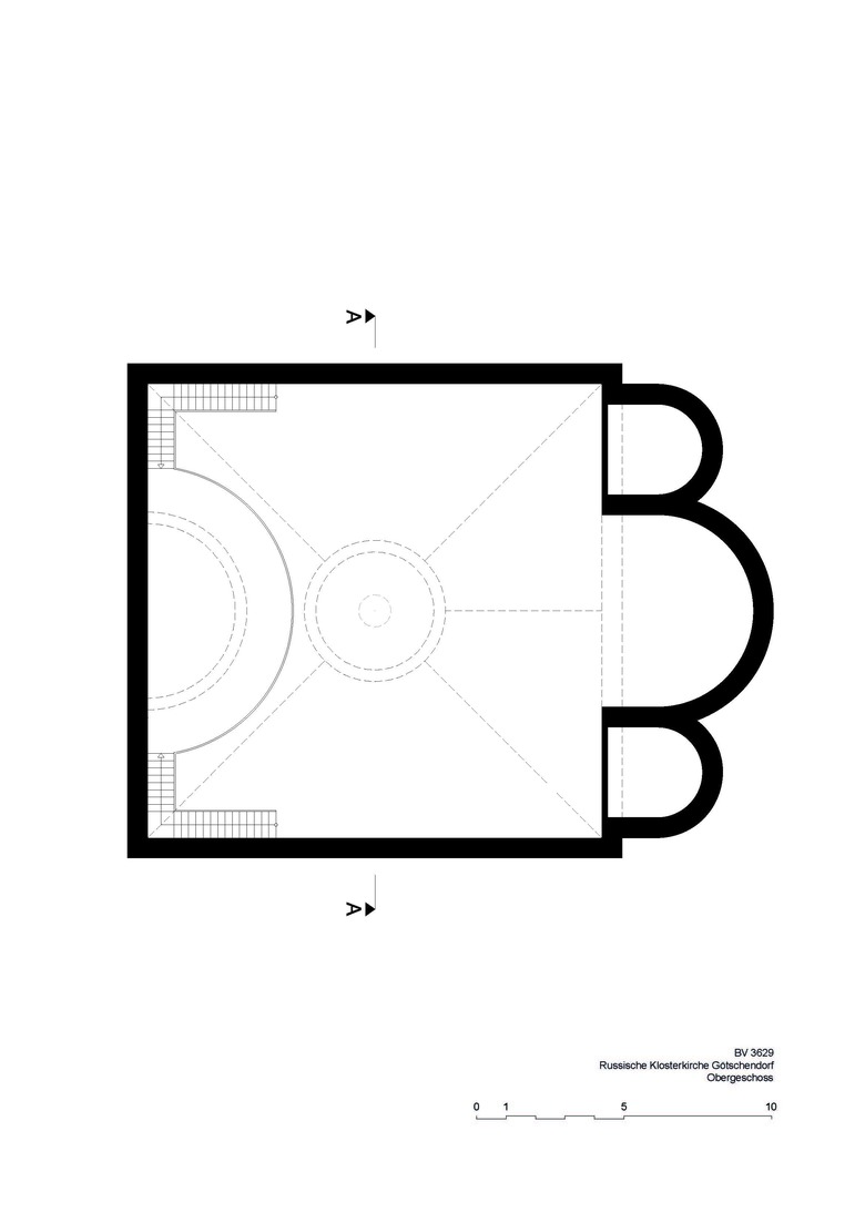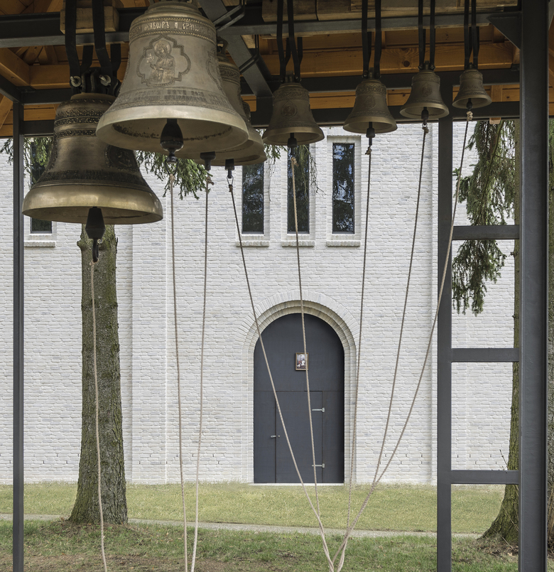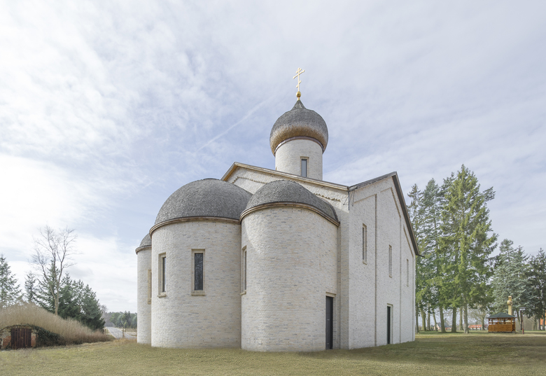 Der Kirchenbau befindet sich seitlich im vorderen Teil des Grundstückes und wird damit zum neuen, sinnstiftenden Blickfang der Anlage. Er ist trotz russisch-byzantinischer Bautradition mit Kuppel, runder Laterne und Zwiebelhaube von berührender Schlichtheit, wobei die Formen modifiziert und vereinfacht wurden. Das viergiebelige, sockellose Volumen hat einen quadratischen Grundriss mit einer 26 Meter hohen Turmspitze und einer Wandlänge von 17 Metern sowie zehn Metern lichter Höhe. Im Bereich des Altarraums ist der Grundriss um drei Apsiden erweitert.
