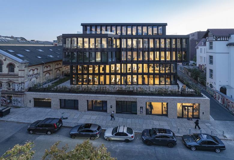 Der Stahlbetonskelettbau mit fünf Ober- und zwei Untergeschossen ruht auf einem massiven, im wilden Klinkerverband verblendeten Sockel, der Materialität und Farbigkeit der umgebenden Industriebauten aufgreift und gleichzeitig neu interpretiert. Der Sockel folgt der straßenseitigen Bebauungsgrenze. Die aufgehenden Geschosse sind rückversetzt und um rund 15 Grad gedreht und lassen den Blick auf die im hinteren Grundstücksbereich befindlichen denkmalgeschützten Brauereigebäude frei. Rings um die freigestellten oberen Geschosse ist der Sockelbereich zur Saarbrücker Straße als großzügige, teilbegrünte Terrassenfläche gestaltet.