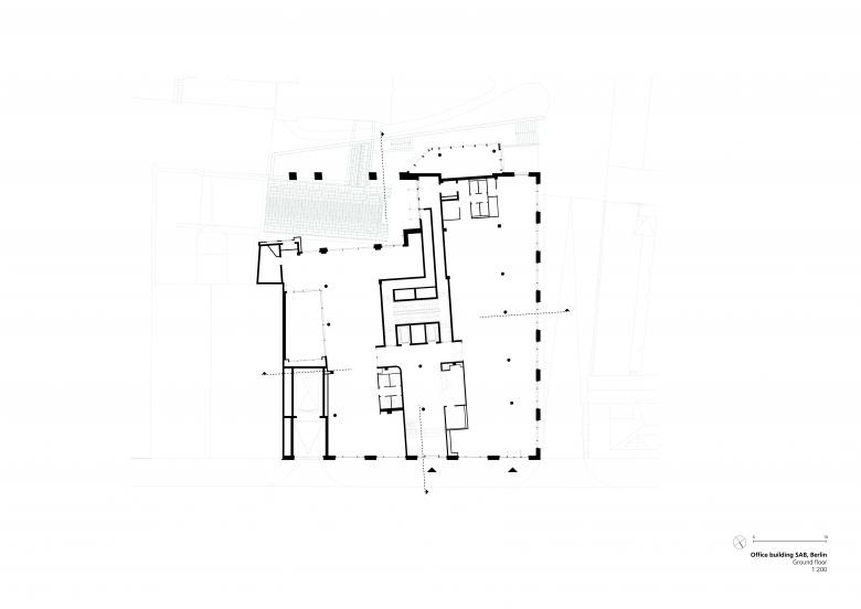 Durch die Bebauung des ansteigenden Grundstückes schneidet das Erdgeschoss um eine halbe Geschosshöhe in das Gelände ein und bildet hofwärts eine teils von den aufgehenden Geschossen überkragte Freifläche aus, in die wie eine historische Ruine der freigelegte Gewölberücken des unterirdischen Bierkellers integriert ist. Zwei erdgeschossige Konferenzräume sind zu diesem besonderen Außenbereich orientiert. Ein weiterer, deutlich kleinerer und allseitig gefasster eingesunkener Hof ist zwischen dem Neubau und dem Nachbargebäude in der Saarbrücker Straße in den Sockel eingetieft und belichtet einen weiteren, im Sockelmassiv gelegenen Besprechungsraum.