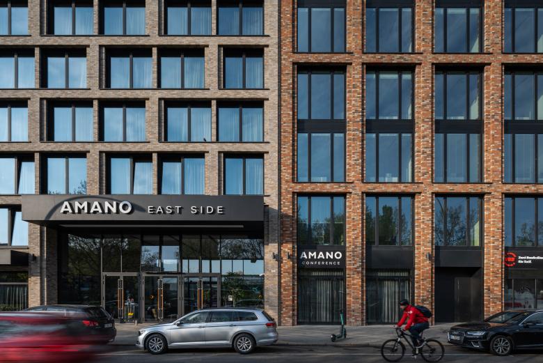 Die Fassade des Hotels ist in alternierende Fensterfelder aufgeteilt, bei denen jeweils zwei Fenster durch Klinkerstege mit matt-pastellfarbenen und changierenden Farbmuster getrennt werden. Somit wird die horizontale Ausrichtung des Gebäudeteils noch verstärkt. Auf der Nord- und Südfassade wird diese regelmäßige, strenge Fassadengliederung durch das öffentlich zugängliche „Spreefenster“ als Sonderelement und einer Glasfassade zum Stralauer Platz beziehungsweise zur Spree im Erdgeschoss unterbrochen.