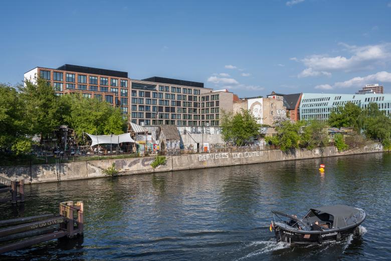 Als neue Bebauung wurde ein zweiteiliger Gebäudekomplex geplant, der sich aus einem achtgeschossigen Hotel im östlichen Abschnitt und einem siebengeschossigen Bürogebäude im westlichen Abschnitt mit einer gemeinsam genutzten, zweigeschossigen Tiefgarage zusammensetzt. Im Bereich des Hotels, an der Grenze zum Bürogebäude, ist der Komplex durch ein zweigeschossiges, 12 m breites „Spreefenster“ unterbrochen, das als Sichtachse dient.